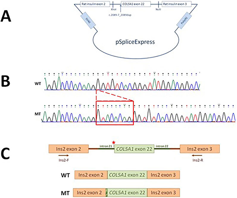 Figure 3. Characteristics of the COL5A1 variant. (A) The pSpliceExpress vector containing a fragment of the COL5A1 gene with the c.2089-7_2089 dup variant with flanking introns was cloned between two rat insulin exons by NotI- and XhoI-compatible overhangs. (B) Sanger sequencing of the WT and mutated transcript. (C) Schematic presentation of the WT and mutated minigene constructs.