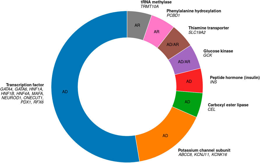 Figure 1. All 19 known autosomal MODY genes, their protein functions, and their inheritance modes. 10 genes code for transcription factors, 3 for potassium channel subunits, and one gene, respectively, for each of the other categories. AD, autosomal dominant; AR, autosomal recessive. Based on Bonnefond et al. (2023) and Sriram et al. (2025).