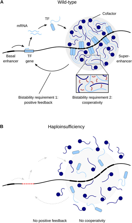 Figure 2. A model of transcriptional regulation of cell fate and its misregulation due to haploinsufficiency. (A) Master transcription factors (TFs) maintain their own expression through positive feedback by cooperatively binding to their own super-enhancers. Cooperative binding occurs through multivalent interactions between TFs and cofactors (inset, red dashed lines). (B) Haploinsufficiency (here caused by TF gene deletion) disrupts positive feedback and cooperativity and thus leads to disease. Adapted from Zug (2022).