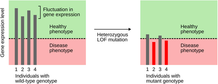Figure 3. An explanation of incomplete penetrance, based on the combined action of stochastic fluctuation in gene expression and a threshold effect. The latter results from TF genes engaging in positive feedback and cooperativity. Heterozygous LOF mutations bring expression levels close to the threshold. Only individuals whose gene expression lies below the threshold (here, individuals 2 and 4) will show a disease phenotype. Based on Hobert (2010).