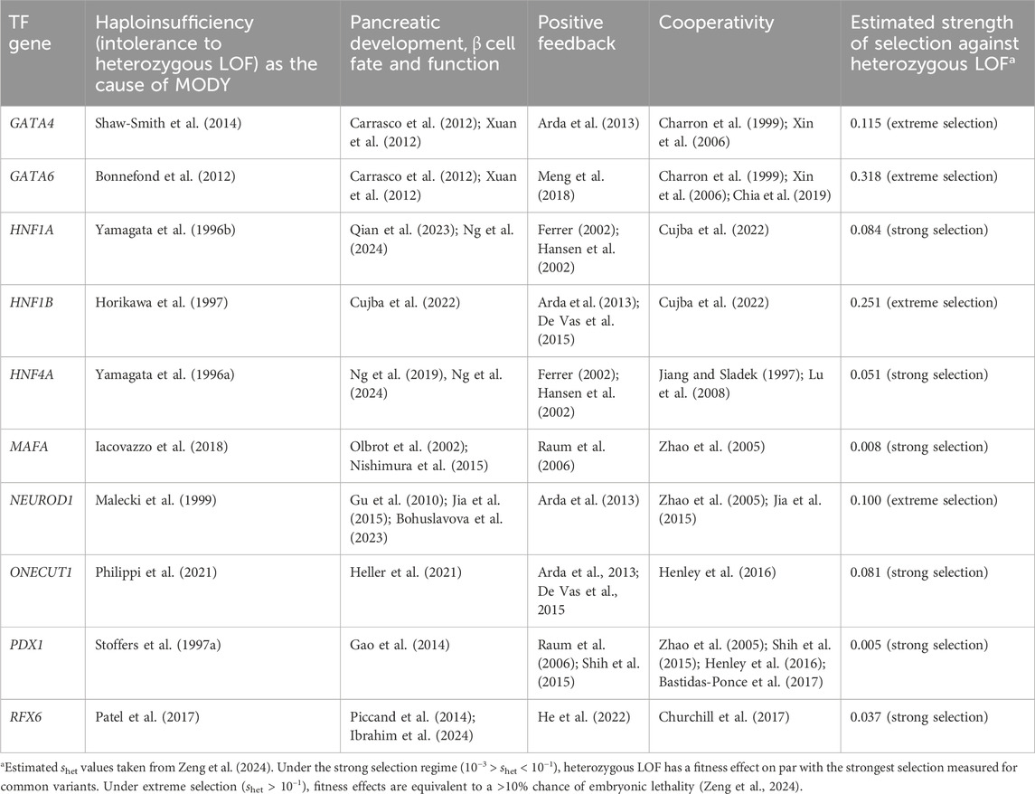 Here I collect evidence in support of the hypothesis that heterozygous LOF variants in MODY-associated TF genes disrupt positive feedback or cooperativity and thus cause the disease. As shown in Table 1, all known MODY-associated TF genes (1) are haploinsufficient, (2) are master regulators of pancreatic development, and of β cell fate and function in particular, (3) engage in positive feedback and cooperativity, and (4) exhibit strong or extreme selection against heterozygous LOF, as estimated by a powerful Empirical Bayes approach (Zeng et al., 2024). Moreover, for HNF1A and HNF4A, disruption of positive feedback (Hansen et al., 2002) and of cooperativity (Hua et al., 2000; Singh et al., 2019) has been identified as the cause of MODY. Taken together, this evidence strongly supports the hypothesis that heterozygous LOF variants in master regulators of β cell fate are sufficient to disrupt TF positive feedback or cooperativity and thus cause MODY. This explains why MODY-associated variants in TF genes are dominantly inherited.