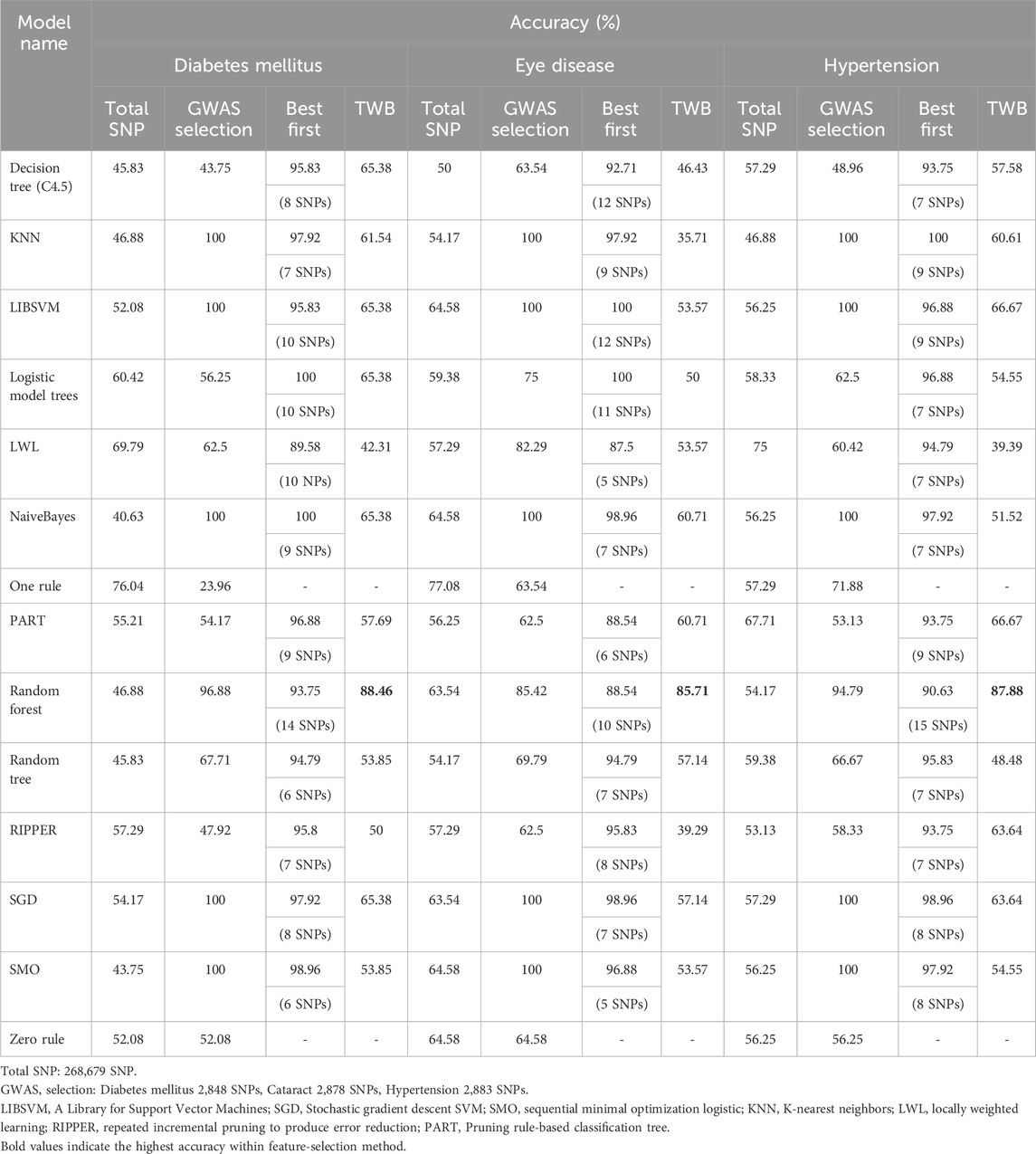 Recognizing the limitations of relying solely on highly significant SNPs, we initially attempted to construct models using all 295,589 SNPs. However, due to feature redundancy and computational constraints, internal performance improved only marginally and external validation yielded limited gains. To enhance predictive efficiency, we applied a more lenient significance threshold (P < 1 × 10−2) to include additional informative variants for model training. A wrapper-based feature selection strategy combined with a best-first search algorithm was implemented to iteratively identify compact yet informative SNP subsets (Supplementary Figures S4 and S5). This process aimed to reduce redundancy and improve model interpretability. Cross-validation was applied to mitigate overfitting, and external validation was conducted using the TWB Hakka cohort to assess generalizability. Across all evaluations, the Random Forest model consistently exhibited the best overall performance, achieving cross-validation accuracies above 88% and external validation accuracies above 85% (Table 1). The final feature sets were small but interpretable, including 14 SNPs for T2D, 10 for eye diseases, and 15 for hypertension (Supplementary Table S2). To compare model behavior under different feature-selection paradigms, we trained 14 classifiers using both GWAS-selected SNPs and machine-learning-based marker subsets. Feature selection was embedded within each training fold (leave-one-out) to prevent data leakage and ensure independent optimization for each model. This model-dependent process allowed each classifier to identify the subset of variants most informative for its decision boundaries, balancing predictive accuracy and biological interpretability.