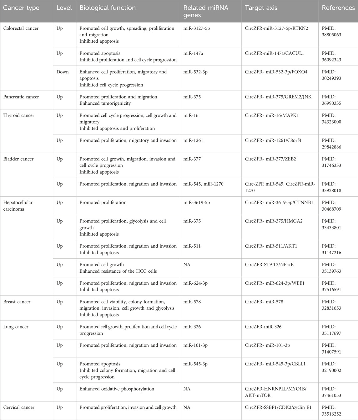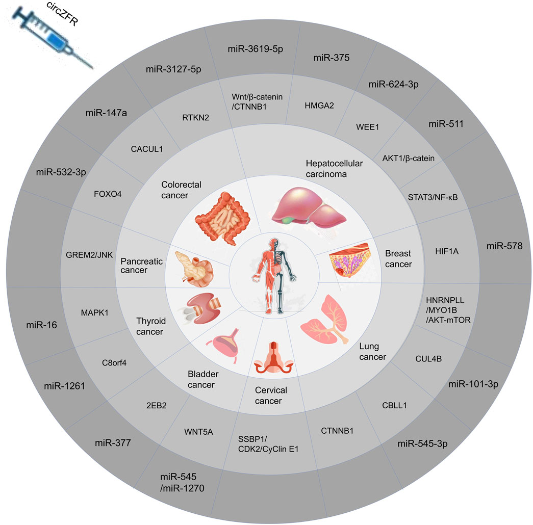 Circular RNA zinc finger RNA-binding protein (CircZFR) is the transcriptional product of the zinc finger RNA-binding protein (ZFR) gene, located on human chromosome 5p13.3. CircZFR plays a dual role in multiple human cancers, acting both as a tumor suppressor and a tumor promoter (Li et al., 2021). Recent studies have shown that CircZFR is closely associated with disease progression in various cancers, including hepatocellular carcinoma (HCC) (Luo et al., 2020; Tan et al., 2019; Xu et al., 2021; Yang et al., 2019), papillary thyroid carcinoma (PTC) (Wei et al., 2018), lung cancer (LC) (Li et al., 2020; Ma et al., 2023; Ren et al., 2020; H. Zhang et al., 2019), bladder cancer (BLCA) (Luo et al., 2020; W.-Y. Zhang et al., 2019), breast cancer (BC) (Chen et al., 2020), cervical cancer (CCA) (Zhou et al., 2021), pancreatic cancer (PC) (Wang et al., 2023), thyroid cancer (TC) (Wei et al., 2018; Xiong et al., 2021), and colorectal cancer (CRC) (Bian et al., 2018; Chen et al., 2024; Tan et al., 2022). Therefore, investigating the functions of circZFR in human cancers and its clinical potential is of great importance (Zhang et al., 2025). This paper will conduct a comprehensive analysis of the functions of CircZFR in various types of cancer, aiming to explore its potential for clinical application in depth.