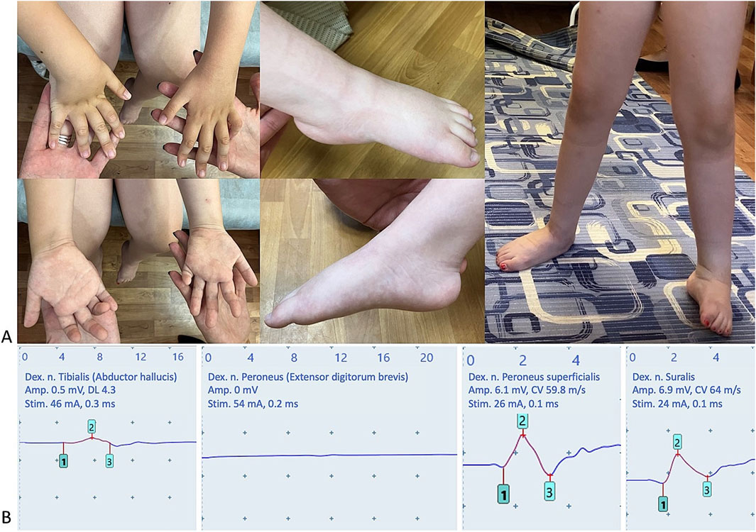At age 6, clinical examination showed height 110 cm (−0.83 SD), weight 22.5 kg (+0.55 SD), and head circumference 51.5 cm (+0.2 SD). She had a normal body habitus with no dysmorphic features and no abnormalities in other organ systems. Neurologic examination revealed dysarthria without other bulbar abnormalities. Examination also revealed atrophy of the forearms, hands, the peroneal muscles, and the feet including the extensor digitorum brevis muscle (Figure 1A). Muscle strength was reduced to 3/5 on the Medical Research Council scale (MRC) in proximal muscles of both upper and lower limbs, 0/5 in intrinsic hand muscles, 0/5 in ankle dorsiflexors, and up to 2/5 in plantar flexors. Interestingly, neck flexor weakness was also noted. Contractures were observed at the ankles and interphalangeal joints of the hands. Deep tendon reflexes were reduced in the upper limbs and absent in the lower limbs. Both axial and appendicular tones were normal, no muscle hypertonia or hypotonia were noted. The patient’s sensory examination (touch, pain, vibration, proprioception senses) showed no abnormalities. Lumbar hyperlordosis, valgus deformity of right foot and cavovarus deformity of left foot were noted. The patient also demonstrated a positive Gowers’ sign and waddling gait with steppage. We observed several brief episodes of intermittent exotropia during the neurological exam, which resolved immediately upon voluntary fixation. No persistent deviation was noted between episodes.