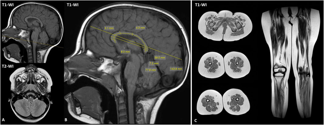 The brain MRI at the age of 3 years appeared unremarkable, without any structural brain anomalies (Figure 2). Corpus callosum morphology was carefully evaluated in the patient (Figure 2B). Measurements were compared with the age- and sex-specific centile tables followed by (Garel et al., 2011), and all fell within the normal range (between the 3rd and 97th centiles) for 3-year-old girls. Lower limb muscle MRI demonstrated diffuse fatty infiltration of lower leg and thigh muscles on T1-weighted images, indicative with a neurogenic pattern (Figure 2C). The adductor longus and adductor magnus were relatively spared. T2 STIR images showed hyperintensity in the posterior compartment of lower leg muscles.