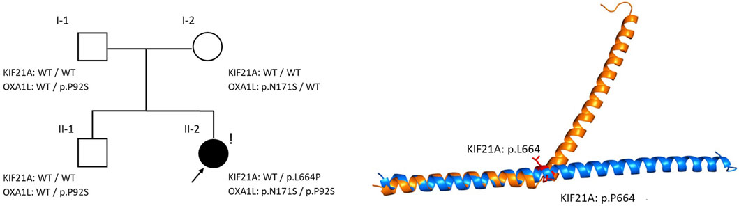 A genetic pedigree chart shows inheritance patterns across two generations. Individuals are marked with KIF21A and OXA1L genotypes, including variations WT/p.P92S, p.N171S/WT, and WT/p.L664P. A structural diagram highlights the KIF21A protein, with helices in orange and blue, and the p.L664 site marked in red.