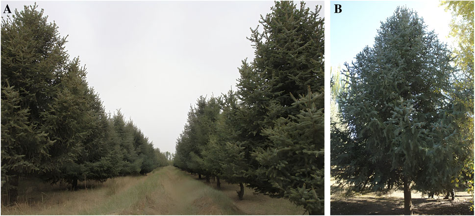 Figure 1. Qinghai spruce asexual seed Orchard. (A) A corner of Qinghai spruce asexual seed Orchard; (B) Excellent single plants of Qinghai spruce.