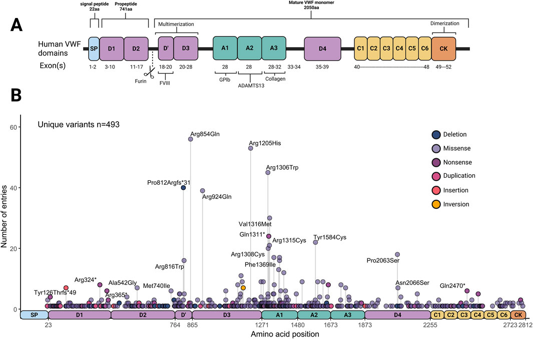 Figure 1. Overview of von Willbrand Factor (VWF) domains, and variant distributions. (A) Von Willebrand Factor domains and binding sites. (B) Distribution and frequency of von Willebrand Factor variants curated in the Leiden Open Variation Database (LOVD) (Accessed and data retrieved on 8-1-2025). Created in BioRender.