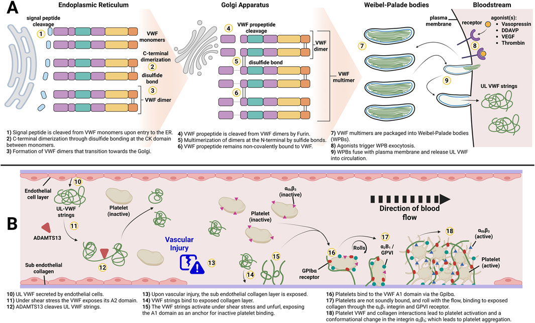 Figure 2. Overview of von Willebrand Factor biosynthesis and its role in primary hemostasis. (A) Key processing steps by endothelial cells of von Willebrand Factor to form Weibel-Palade Bodies. (B) Function of HMW secreted from WPBs. Adapted from Leebeek and Eikenboom, 2016. Created in BioRender.