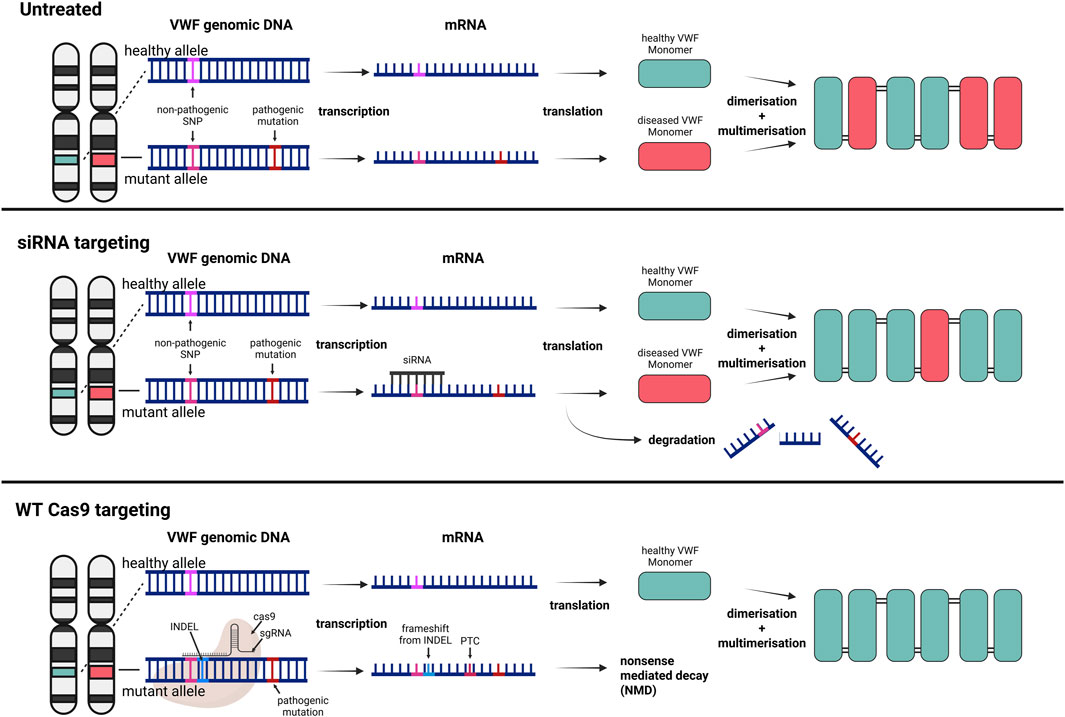 Figure 3. Broad targeting gene therapy strategies for dominant negative VWD variants to increase the ratio of healthy to diseased VWF subunits. Top) Untreated VWD results in VWF multimers consisting of healthy and diseased subunits. Middle) Selective siRNA targeting of a benign SNP on the mRNA originating from the mutant allele results in degradation of the transcript and a higher ratio of healthy to mutant VWF subunits. Bottom) The same targeting approach of a benign SNP, but the Cas9 directly targets the genomic DNA and induces a frameshift and premature termination codon (PTC). The knockout of the mutant allele results in sole expression of healthy VWF monomers. Created in BioRender.