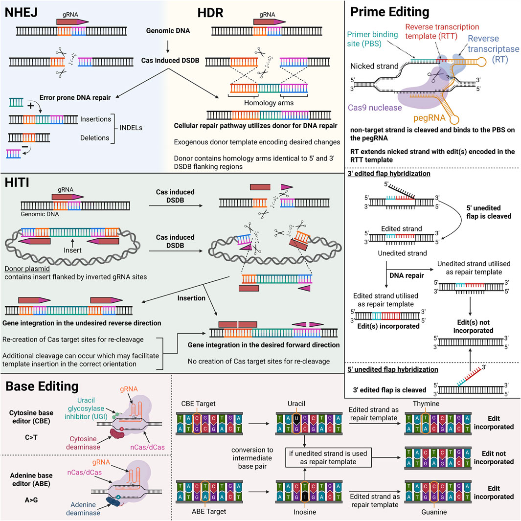 Figure 4. Illustration of different CRISPR-Cas modalities and their mechanisms of genomic DNA modification. Created in BioRender.