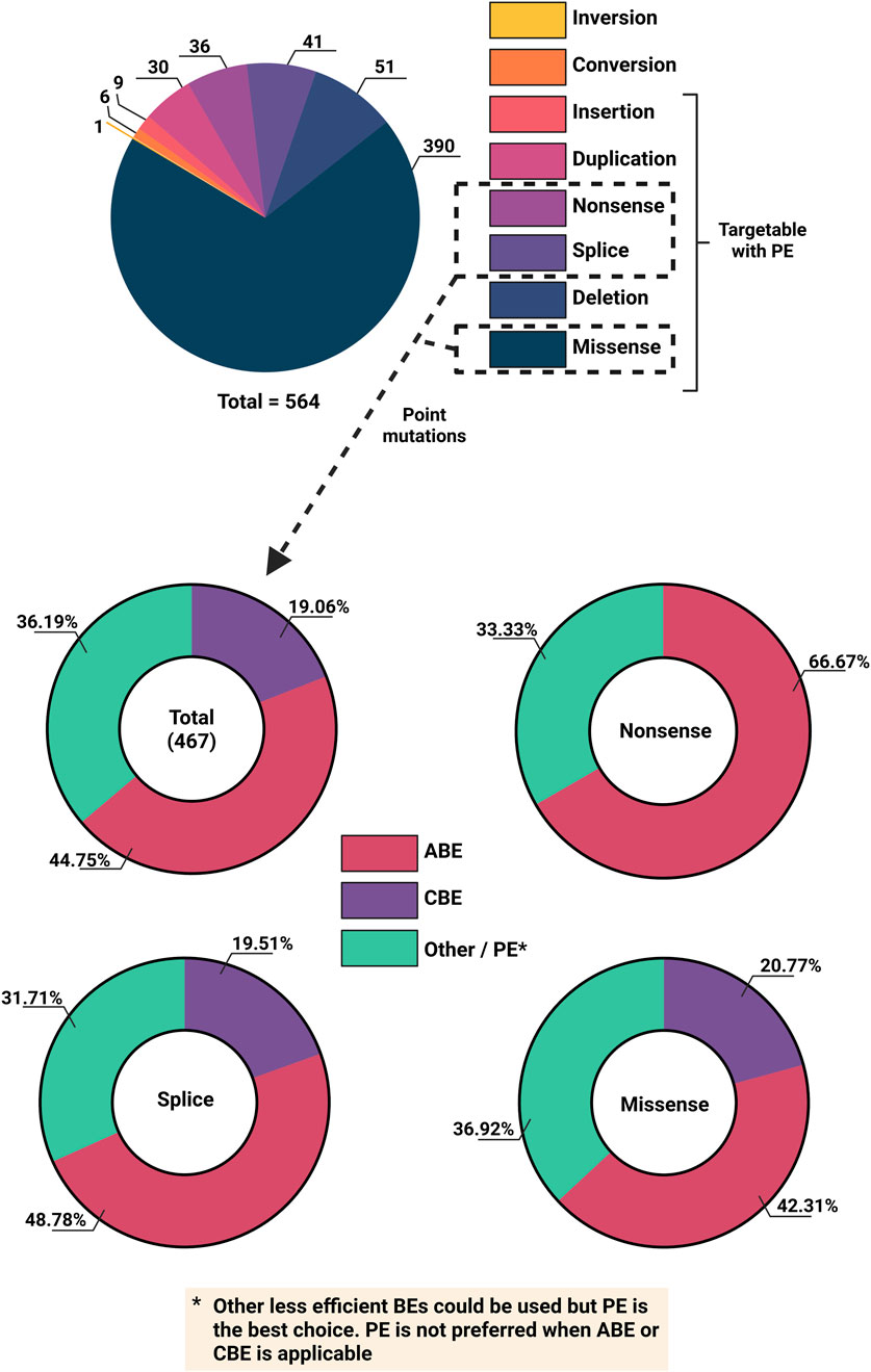 Figure 5. Overview of VWD mutation types and feasibility for base editing from the Leiden Open Variant Database (LOVD). Top) Number of different VWD mutation types. Bottom) Different CRISPR-Cas base editing technologies to target total Splice, Missense and non-Sense variants (and individually).