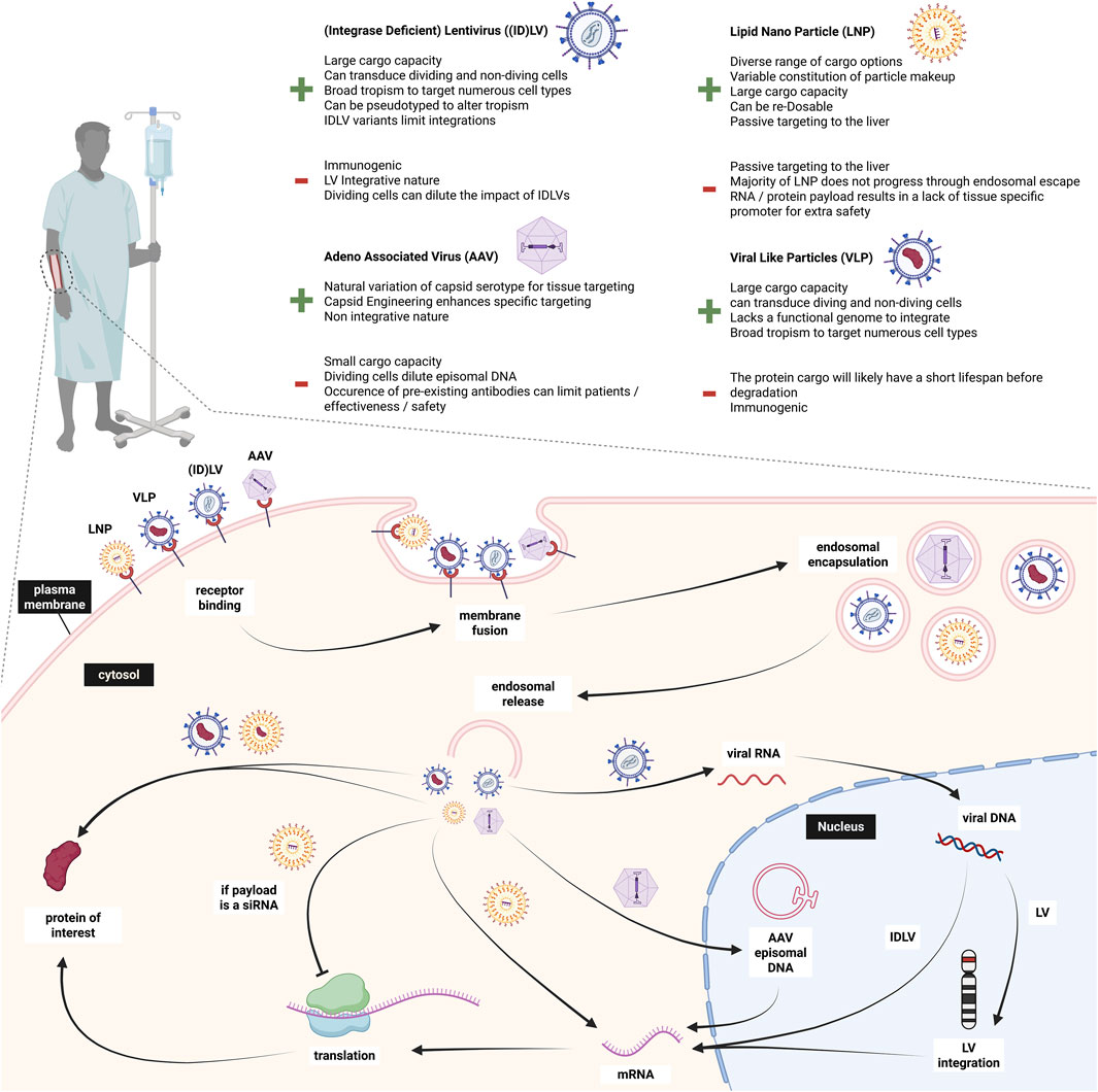 VLPs may provide an alternative to traditional LV approaches by combining the benefits of viral and non-viral delivery. VLPs are generated utilizing a fusion of the transgene of interest to the LV matrix gag protein. The most popular VLPs are pseudotyped with VSV-G glycoprotein, HIV-1 envelope glycoprotein and so-called ‘nanoblades’, which are murine leukemia VLPs loaded with Cas9-sgRNA ribonucleoproteins (RNPs) (Mangeot et al., 2019). Essentially a LV capsid is produced encapsulating the protein of interest, but while the envelope and capsids are viral components, the genome is non-viral. The cargo of mRNA, proteins or RNPs increase the safety by staying transiently expressed instead of integrating into the host genome. This improves CRISPR-Cas therapies regarding off-target activity and host immune response against the Cas protein, while still facilitating efficient genome editing (Lyu et al., 2019). The group of David Liu have engineered VLPs specifically to deliver BEs and PEs, which renders them promising delivery tools in vivo (An et al., 2024; Banskota et al., 2022). Furthermore, VLPs are relatively cost-effective and easily produced but the batch variability remains problematic (Jaron et al., 2022). Moreover, the immune response and rapid clearance of VLPs in vivo remains a potential concern. For further reading on this topic, see the reviews from Gupta et al. (2023), Nooraei et al. (2021), and Tariq et al. (2022).