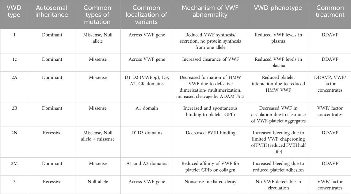 The different types of VWD often arise from mutations impacting different domains of VWF (Figure 1A). Currently, more than 750 unique pathogenic VWF mutations are known, leading to a range of bleeding complications including mucocutaneous bleeding, heavy menstrual bleeding, joint bleeds, gastrointestinal bleeding and bleeding during surgery (de Jong and Eikenboom, 2017; Weyand and Veronica, 2021). The Leiden Open Variation Database (LOVD) alone reported a list of 505 VWF variants that were found in VWD patients in the clinic, of which ∼450 were missense and nonsense variants (Seidizadeh et al., 2023). Utilizing those variants from the LOVD database as an example, Figure 1B illustrates the distribution of VWF variants. Variants resulting in type 1 and 3 VWD can be found throughout VWF. In contrast, type 2 VWD variants are often located around the A1 domain, affecting the binding to platelets and/or collagen, or around the D’D3 or CK domains, impacting multimerization. More VWF variants have been reported by various studies and can be found in additional databases such as ClinVar, GnomAD, genome browser, human gene mutation database (HGMD) and more (UCSC, 2025; gnomAD, 2025; NCBI, 2025; HGMD, 2025). Although the prevalence of VWD subtypes varies per database and cohort, multiple studies have shown that type 1 VWD is by far the most common form, accounting for around 60%–85% of VWD cases. Type 2 VWD follows as the second most common with a prevalence of 15%–45% (Soucie et al., 2021; Seidizadeh et al., 2023). Orphanet estimates the prevalence of type 1 VWD worldwide to be 1–5/ 10,000, and the prevalence of type 2 VWD worldwide to be 1–9/1,000,000 (Orphanet, 2025a; Orphanet, 2025b). Type 3 VWD remains the rarest form of the disease.