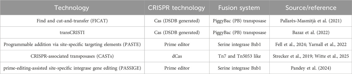 Table 2. Overview of CRISPR-Cas based transposon and integrase technologies to facilitate large insertion templates.