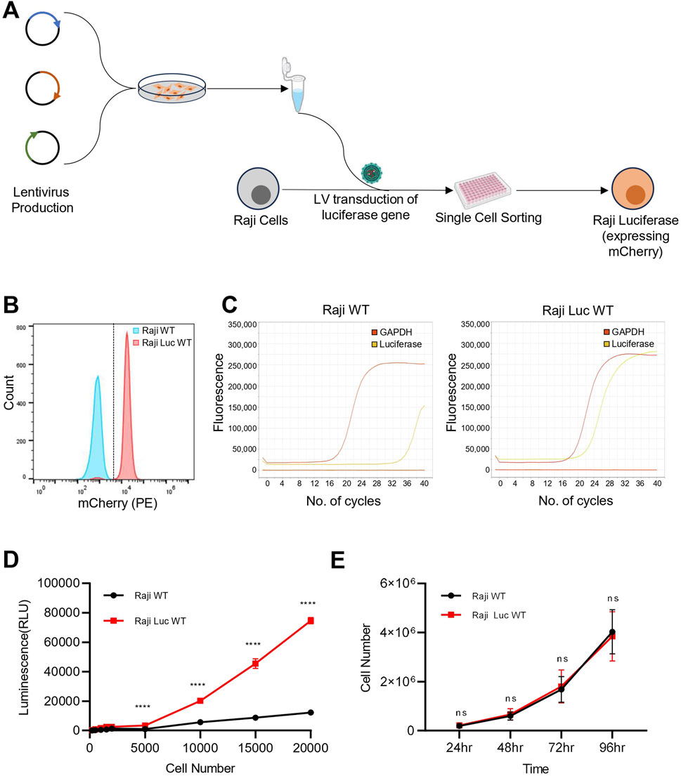 Figure 1. Raji-Luc-WT stably express functional luciferase-mCherry and retain parental features. (A) Schematic representation of the experimental workflow for generating Raji-Luciferase line from Raji WT. (B) Flow cytometry analysis confirming stable expression of mCherry in the Raji-Luc-WT. (C) qRT-PCR analysis showing robust luciferase gene expression in Raji-Luc-WT cells while no detectable amplification was observed in untransduced Raji-WT cells (Ct > 35). GAPDH was used as a housekeeping control. Data shown is the representative of three independent experiments. (D) Luciferase activity assay demonstrating dose-dependent luminescence in Raji-Luc-WT cells across increasing cell numbers. Parental Raji-WT cells showed negligible luminescence under the same conditions, confirming functional transgene expression. (E) Proliferation assay comparing Raji-Luc-WT and parental Raji-WT cells over 96 h. Both cell lines exhibited similar growth kinetics. Data plotted represents mean ± SD. Statistical analysis was performed using multiple unpaired t-tests with Holm–Šidák correction for multiple comparisons. ****p < 0.0001; ns = not significant.