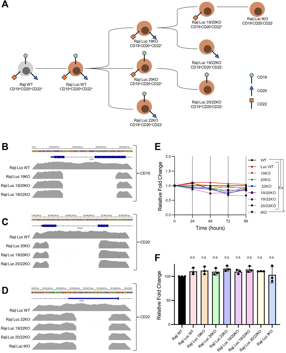 Flowchart and graphs related to Raji cell line variations. A: Diagram showing different knockouts (KO) of CD19, CD20, CD22, with color-coded symbols. B-D: Genomic read coverage for CD19, CD20, and CD22 across various cell lines. E: Line graph showing relative fold change over time for different cell lines. F: Bar graph comparing relative fold change with no significant differences noted (ns).