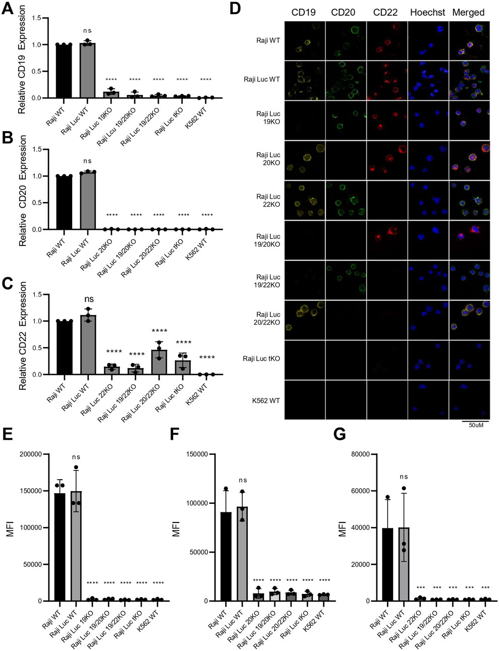 Bar charts (A, B, C, E, F, G) display expression levels of CD19, CD20, and CD22 across various cell types, showing notable reductions in knockouts. Images in panel D illustrate fluorescent staining of CD19, CD20, CD22, and the merged view, highlighting differences in protein expression across the cell lines.