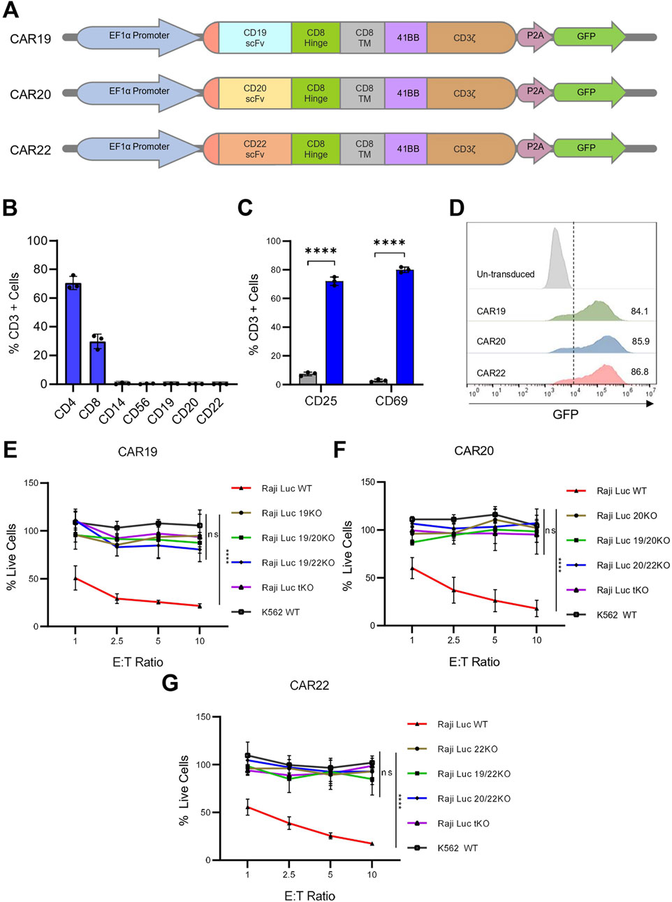 Figure 4. Raji KO lines model antigen loss and resist CAR-T cell–mediated cytotoxicity. (A) Schematic representation of CAR constructs targeting CD19, CD20, and CD22. (B) Flow cytometric analysis of isolated T cells confirmed the expression of T cell–specific markers and negligible expression of non–T cell markers. (C) Expression of T-cell activation markers on isolated T cells post 48 h of activation with CD3/CD28 beads. (D) Flow cytometry of GFP expression in T cells 48 h post-transduction. Histogram shown from one of three independent transductions using T cells from three different donors. (E–G) Viability of Raji KO lines assessed by bioluminescence following 16 h co-culture with CAR T cells expressing CAR19 (E), CAR20 (F) or CAR22 (G) at indicated effector-to-target (E:T) ratios. Percent live cells was calculated based on luminescence signal relative to target-only control and normalized to untransduced controls. CAR-T cells selectively eliminated WT Raji cells expressing the corresponding target antigen, while respective single, double, and triple KO lines remained resistant. K562 cells served as antigen negative control. Data are presented as mean ± SD for three independent biological replicates. Statistical analysis was performed using multiple unpaired t-tests (one per row) with Holm–Šidák correction for multiple comparisons (C) or by comparing area under the curve for each cell line group in an ordinary one-way ANOVA with Dunnett’s multiple comparisons test (E–G). ***, p < 0.001; ****, p < 0.0001; ns = not significant.