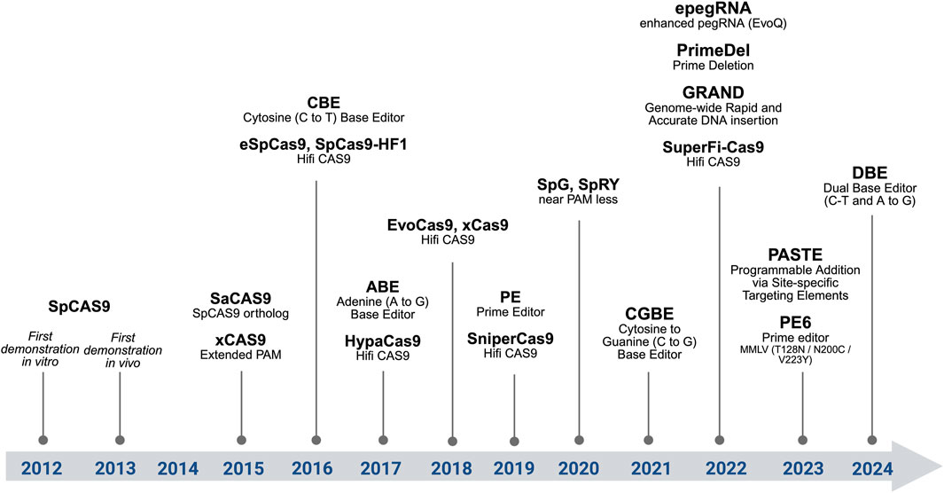 Figure 1. Chronological overview of major genome editing innovations. From SpCas9, high-fidelity variants, SpCas9 orthologs, base editors, prime editors, and advanced strategies (dual pegRNAs, PASTE).