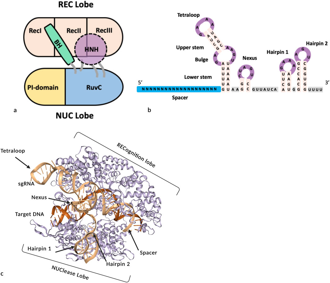 Figure 2. Schematic representations of SpCas9, sgRNA and the SpCas9/sgRNA/DNA complex. (a) Diagram of the main structural domains of SpCas9 domains, inspired by (Nishimasu et al., 2014; Dong et al., 2022). (b) Structural representation of the sgRNA. (c) 3D model of the SpCas9/target DNA/sgRNA complex generated with WebGL (4UN3, ProteinDataBank).