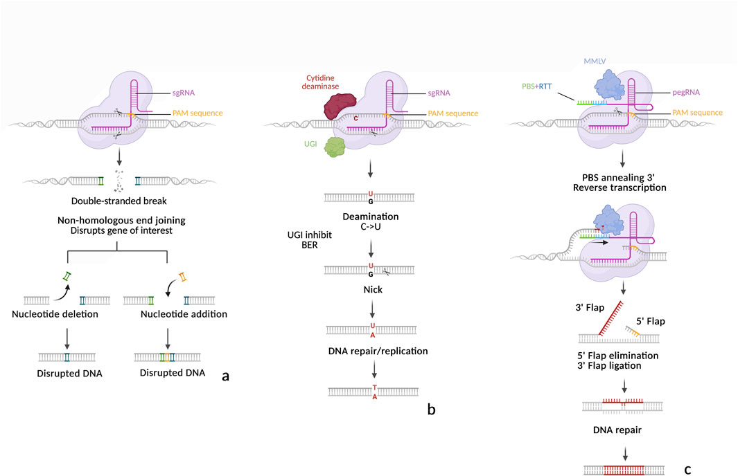 Figure 3. Schematic representation of SpCas9, Cytosine Base editor (CBE) and Prime editor (PE). (a) SpCas9-induced mutations. Upon recognition of the targeted strand by the SpCas9-sgRNA complex, SpCas9 cuts both the target strand and non-target strands, 3 nucleotides upstream of the PAM. The resulting DSB is repaired by NHEJ, which may restore the native sequence or introduce mutations through base pair insertions or deletions. (b) Cytosine Base Editing (BE3). The cytosine deaminase converts a cytosine (C) to an uracil (U) on the non-target strand. UGI inhibits BER to stabilize the U, while the nickase (D10A) cleaves the target strand near the PAM, triggering MMR of the unedited strand. The guanine (G) is then replaced by adenine (A) and during replication, the U is interpreted as thymine (T). (c) Prime editing (PE2). After recognition of the target strand, the nickase (H840A) cuts the non-target strand near the PAM. The primer binding site (PBS) anneals the complementary ssDNA, allowing MMLV to reverse transcribe the RT template. Competition between the 5′ and 3′ ssDNA flaps follows. If the 3′ flap is retains, it can form a heteroduplex with the unedited strand. MMR may then resolve the heteroduplex, leading either to insertion of the edited sequence or restoration of the original DNA.