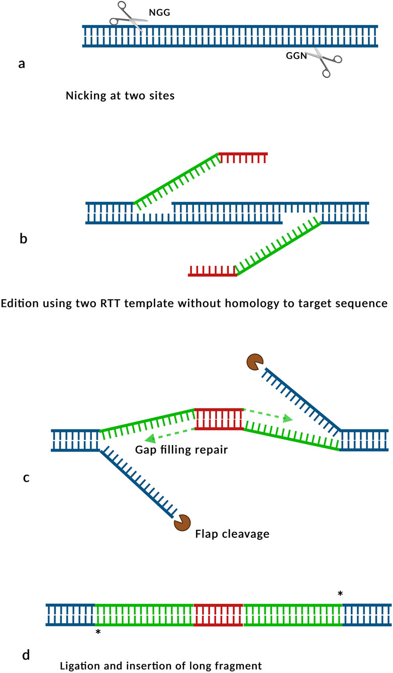 Figure 4. Schematic representation of insertion via GRAND. (a) Following nicking and PBS annealing, (b) the RT templates are extended by reverse transcriptase, generating DNA flaps composed of specific (green) and complementary (red) sequences. (c) The 5′flaps are processed, and the overlapping regions are resolved through gap filling, (d) the original genomic fragment is excised and replaced by the newly synthetized DNA segment. Inspired by Wang J. et al. (2022).