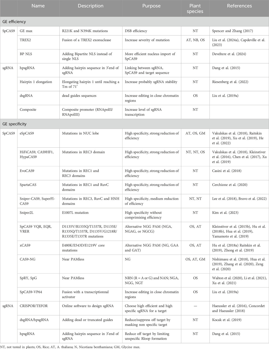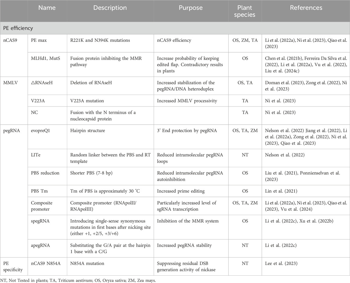 Prime editing represents a major advancement from CRISPR/Cas9 technology, offering precision beyond traditional genome editing tools. The prime editor is composed of an nCas9 (H840A or D10A) fused to the N-terminus of a reverse transcriptase, initially from Moloney murine leukemia virus (MMLV) and a modified sgRNA called pegRNA. This technology was introduced and validated in 2019 by Anzalone et al. (2019). The nCas9-MMLV complex binds to its target to form an R loop, after which nickase cleaves the nontarget strand (Figure 3c). The free 3′ hydroxyl end of the nontarget strand then binds to the PBS (primer binding site) of the pegRNA 3′extension. The MMLV then reverse transcribes the template (pegRNA 3′ extension) containing the mutation(s) to be introduced from the free DNA 3′ end, which has a priming function for the initiation of reverse transcription. Following removal of the 5′flap, the 3′flap can anneal to the target site, forming a DNA heteroduplex. In the original versions of prime editors, such as PE1 and PE2 (Anzalone et al., 2019), the heteroduplex is spontaneously resolved by MMR by returning either to the WT sequence or the sequence to be introduced. In the PE3 version (Anzalone et al., 2019), a second and classic guide is used to cleave the target strand at a short distance from the introduced mutations, favoring the introduction of the targeted mutation by MMR. This technology provides a broader range of flexibility than base editing making it more versatile for complex genome modifications. In theory, it can be used to introduce almost any mutation needed, ranging from a single modified base to more complex modifications (deletions, insertions, modifications of several bases, etc.). Initial attempts to apply PE in plants showed low efficiencies, typically under 1% and rarely above 10% (Li H. et al., 2020; Lin et al., 2020). Numerous improvements were soon published, enabling plant biologists to obtain rates increasingly close to those obtained in animal systems but also to improve specificity, defined as creating the desired allele while reducing or eliminating unwanted alleles. Recent studies have reported optimized plant prime editors capable of achieving over 20% efficiency for multi-nucleotide edits and small tag insertions in rice, with minimal indel formation (Li et al., 2023; Zhong et al., 2024). Table 3 summarizes all of the PE improvements described in the following paragraphs.