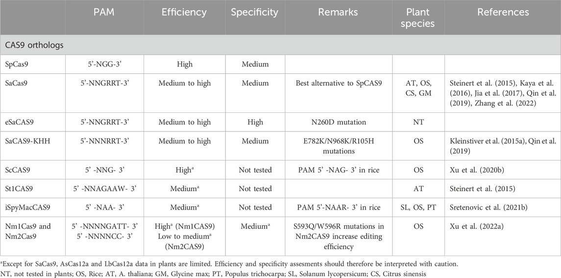 There are many orthologs to SpCas9 from different prokaryotic organisms that have been used in plants, such as SaCas9 (Staphylococcus aureus Cas9) (Steinert et al., 2015), iSpyMacCas9, a hybrid between the PAM interacting (PI) domain of SpCas9 and the PI domain of Cas9 SmacCas9 (Streptococcus macacae Cas9) (Sretenovic et al., 2021b), St1Cas9 (Streptococcus thermophilus Cas9) (Steinert et al., 2015), Nm1Cas9 and Nm2Cas9 (Neisseria meningitidis Cas9) (Xu R. et al., 2022) or ScCas9 (Streptococcus canis Cas9) (Xu et al., 2020b). They offer certain advantages over SpCas9, such as recognition of alternative PAMs (Table 2), but have variable efficiencies and fidelity. SaCas9 is the most interesting alternative to SpCas9 in plant genome editing, with comparable or even superior editing efficiency than SpCas9 in many plant species (Steinert et al., 2015; Kaya et al., 2016; Jia et al., 2017; Qin et al., 2019; Zhang et al., 2022). Unlike SpCas9, SaCas9 recognizes a more specific PAM sequence (5′-NNGRRT-3′) which may limit the range of editing target regions. To broaden the number of targetable sites, the SaCas9-KKH variant, incorporating E782K/N968K/R105H mutations, recognizes an expanded PAM (5′-NNNRRT-3′) (Kleinstiver et al., 2015a) and appears to be as effective as the original nuclease in rice (Qin et al., 2019). Additionally, a high-fidelity variant of SaCas9 (N260D mutation) has been developed to minimize off-targets but has not yet been used in plants (Xie et al., 2020).