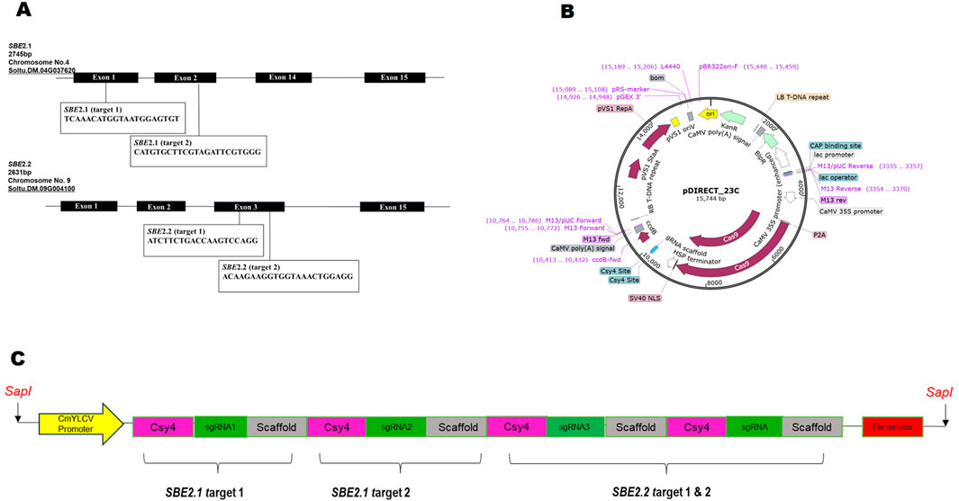 For precise CRISPR-Cas9 mediated editing of SBE2.1 and SBE2.2 genes, two sgRNAs targeting exon 1 and exon 2 of SBE2.1 and two sgRNAs targeting exon 3 of SBE2.2 were selected. The sgRNAs with highly specificity were chosen based on an out-of-frame score greater than 67 and a GC content ranging between 40% and 60%. These sgRNAs were located adjacent to the protospacer adjacent motif (PAM) sequences and carefully designed to avoid off-targets effects and ensure efficient Cas9-mediated cleavage (Figures 1A,B; Table 1). The designed sgRNAs were subsequently assembled with the Csy4 gene driven by the CmYLCV promoter and cloned into the pDIRECT_23C vector (Table 2; Figure 1A).