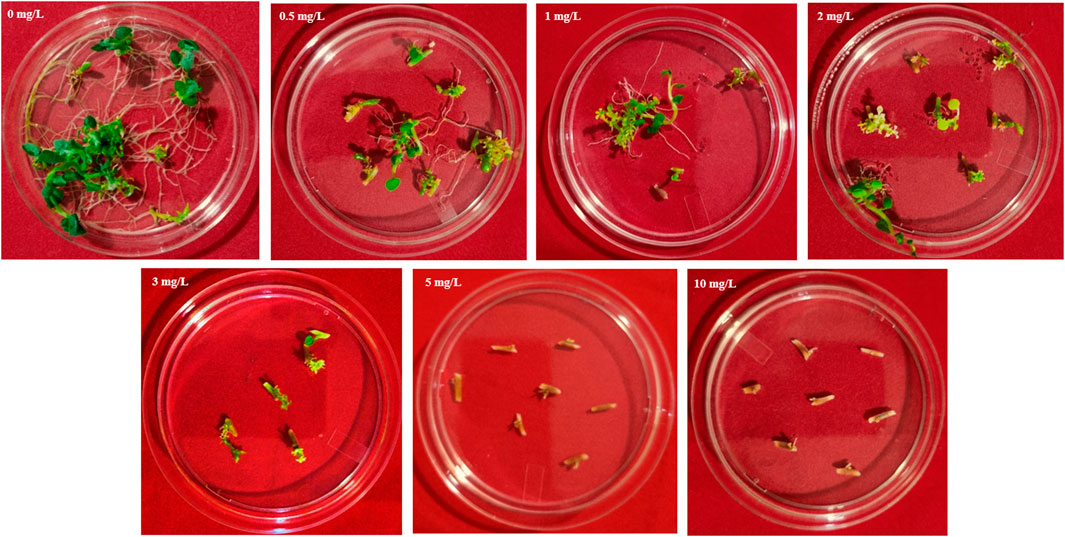 Seven petri dishes show plant growth under different concentrations of a substance, ranging from 0 milligrams per liter to 10 milligrams per liter. Increased concentrations correlate with decreased plant growth and more brown discoloration, especially at concentrations of 5 and 10 milligrams per liter, where plants appear more wilted and brown.