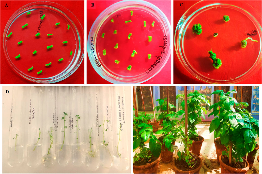 Figure 3. Genetic transformation of Kufri Chipsona-I with A. tumefaciens harbouring SBE-pDIRECT23C construct; (A) internodal explants cultured on MS medium, (B) callus induction and proliferation, (C) shoot regeneration, (D) shoot elongation and rooting, (E) hardened transformed plants.