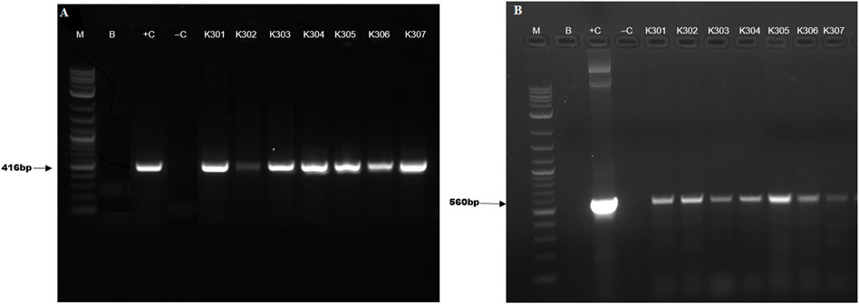 Gel electrophoresis results showing two panels. Panel A has bands labeled M, B, +C, -C, and K301 to K307, with a prominent band at 416 base pairs. Panel B features similar labels with noticeable bands at 560 base pairs. Both panels contain a molecular marker (M).