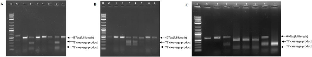 A set of three gel electrophoresis images labeled A, B, and C. Each image shows DNA fragments within lanes marked by labels including M (marker), C (control), and numbers 1 to 7. Lanes contain bands of varying intensity, indicating DNA fragments of specific lengths, highlighted by arrows showing full-length and fragment sizes, such as 487 bp, 497 bp, and 646 bp. T7 cleavage products are marked in each panel, distinguishing between full-length and cleaved DNA products.