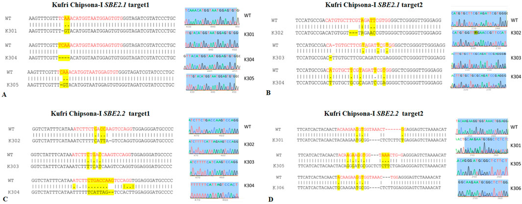 DNA sequence alignments for Kufri Chipsona-I targeting SBE2.1 and SBE2.2 are displayed across four panels labeled A, B, C, and D. Differences in nucleotides are highlighted in yellow. Each panel includes chromatograms for wild type (WT) and mutant samples (K301-K306). Specific nucleotide changes are indicated in bold and with dashes for deletions.