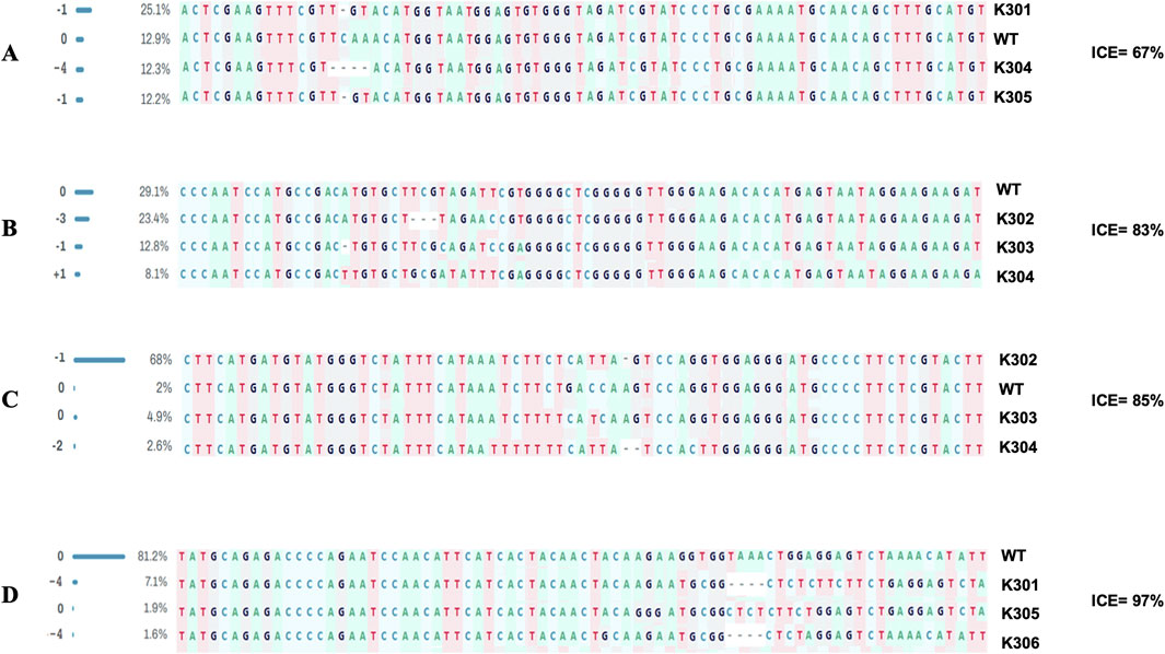 Genomic sequence alignment data with four panels labeled A, B, C, and D, each showing DNA sequences with varying percentages and insertion, deletion, or substitution mutations. Each panel displays sequence variations compared to wild type (WT) and other variants like K301, K302, etc. ICE scores, representing editing efficiency, are noted as follows: A: 67%, B: 83%, C: 85%, D: 97%.
