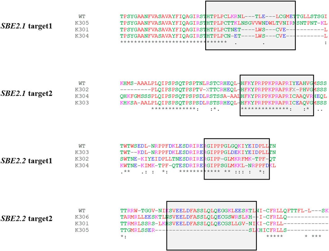 In silico protein translation of SBE2.1 and SBE2.2 gene sequences of the wild-type Kufri Chipsona-I and mutated lines was done using the Expasy-Translate tool. The translated sequence alignment for target 1 of SBE2.1 gene revealed the frame shift mutation in K305 and premature stop codons (PSCs) in K301 and K304 edited lines. Target 2 of the SBE2.1 gene showed a frame shift mutation in K303 and K304, and PSCs in K302 edited lines. Similarly, for the SBE2.2 gene, K303, K304 showed a frame shift mutation in target 1, while PSCs were observed in K302 (target 1) and K301, K305, K306 (target 2) mutated lines (Figure 8).