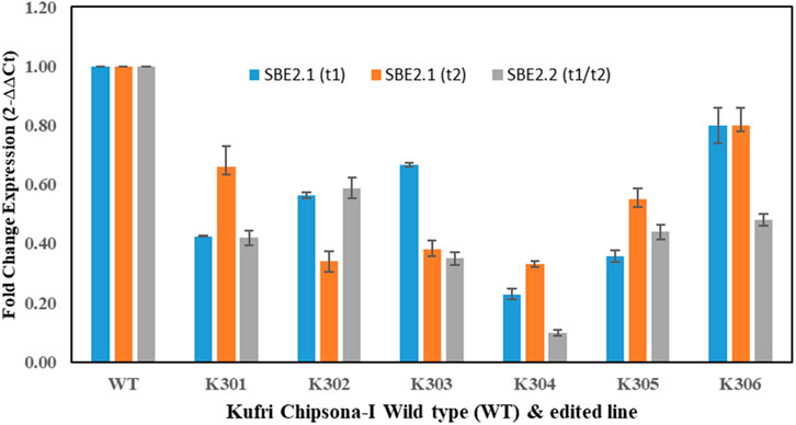 In the present study, a qRT-PCR analysis revealed that the expression levels of SBE2.1 and SBE2.2 genes were significantly lower in all edited lines compared to the unedited wild-type Kufri Chipsona-I. The lower expression levels of SBE2.1 and SBE2.2 genes, suggested that gene editing has influenced starch metabolism in these edited lines, possibly leading to higher amylose content. In a similar study, editing of SBE2.1 and SBE2.2 genes in potato has shown altered amylopectin structure and a higher amylose-to-amylopectin ratio (Zhao et al., 2021). Li et al. (2023) have also reviewed that the downregulation of SBE genes would lead to modified starch production for increased dietary fiber.