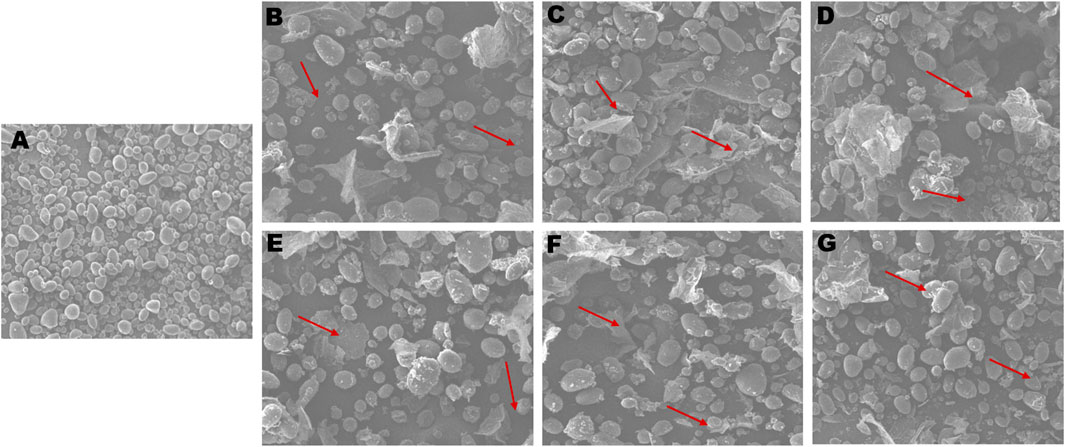 The substantial increase in resistant starch among these mutants, especially in K304, has proved it as a strong candidate for health-oriented applications, such as low-glycemic index foods and functional starch-based products developing functional foods targeting metabolic health. The SEM analysis of all the SBE2.1 and SBE2.2 mutated lines showed deformities, granulation of large size granules, and rough outer surface of starch granules. The weak packaging of amylopectin chains and poor integrity of starch molecules would have led to these deformities in starch granules. Kaul et al. (2023) have also demonstrated that the chemically modified starches may lead to structural changes and irregularities in pre-gelatinized starches.
