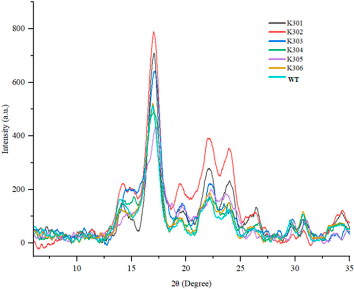 Figure 11. X-ray diffraction patterns of mutant (K301-K306) and Wild-type Kufri Chipsona-I potato lines.
