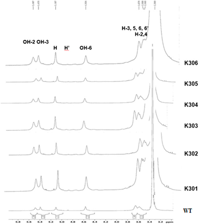 NMR spectra showing multiple overlapping peaks, labeled with chemical shifts and hydrogen assignments such as OH-2, OH-3, OH-6, and H-3, 5, 6, 6'. The labels K301 to K306 and WT are on the right, indicating different samples or conditions. The x-axis represents chemical shift in parts per million (ppm).