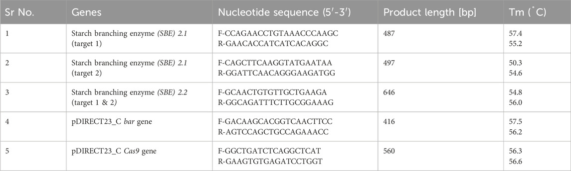 To identify the CRISPR-Cas9 induced mutation at the sgRNA target sites, the genomic DNA of all the obtained transformed lines, as well as the wild type, were amplified with SBE2.1 (target 1 & 2) and SBE2.2 (target 1 & 2) forward and reverse sequence-specific primers (Table 2). These amplified gene fragments were purified using Qiagen QIAquick gel extraction kit and sequenced using BigDye™ Terminator v3.1 ready reaction mix following the cycling program with an initial denaturation step at 96 °C for 1 min followed by 25 cycles at 96 °C for 10 s, 50 °C for 5 s, and 60 °C for 4 min. The amplified products were purified using a Qiagen DyeEx 2.0 spin kit and sequenced using a Genetic Analyzer 3,500 (Applied Biosystem, United States). The mutation types and editing efficiencies of the selected gRNAs were analyzed using Synthego ICE Analysis tool (https://ice.synthego.com).