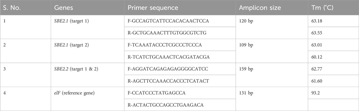 For gene expression analysis, qRT-PCR of SBE2.1 and SBE2.2 genes of edited potato lines as well as wild type, the RNA was isolated using the plant mini kit (Qiagen). RNA concentration and quality was analysed using a Nanodrop Spectrophotometer (Thermo Scientific), and cDNA was synthesized using high-capacity cDNA reverse transcription kit (Applied Biosystems™). The qRT-PCR reaction mixture comprised of 7.5 μL SYBR green PCR master mix (Applied Biosystems™), 1 μL of respective (10 μm) forward and reverse gene specific primers (Table 3), 4.5 μL water, and 1 μL cDNA, for a total reaction volume of 15 μL. The qRT-PCR was performed in triplicate, taking the housekeeping gene elf (elongation factor) as a reference gene. Specificity of the primers was confirmed by melting curve analysis. The generated Ct values of target genes were normalized to the Ct value of the reference gene. Relative expression was calculated using the 2−ΔΔCT method and expressed as fold increase with respect to control.