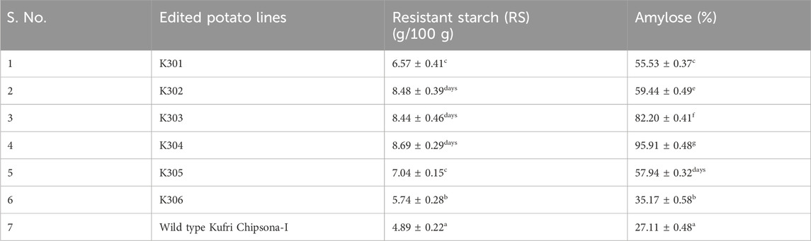 The total starch content was found to be similar in all the SBE2.1 and SBE2.2 mutated lines as well as wild type Kufri Chipsona-I. These results suggested that the proportion of amylose and amylopectin may have changed, while the total starch composed of glucose units remains almost the same (Smith et al., 2017). The difference in total starch content reflects either downregulation of these biosynthetic genes or increased activity of starch-degrading enzymes such as amylases or glucan water dikinases (GWD) (Martens et al., 2018). Elevated resistant starch in mutant line K304 (8.69%) is likely to arise from structural changes in starch granules, particularly due to the increased amylose content. In a similar study, high resistant starch was reported in SBE2 mutant Cassava plant with 56% high amylose content (Luo et al., 2022), and also 53.48% high amylose was reported in Cas9-mediated SBEIIb edited gene in maize (Ma et al., 2024). Zhao et al. (2021) reported a high (89%) amylose producing SBE1 and SBE2 mutant potato lines. Whereas, a 40% increase in amylose content was reported in SBE-mutated potato lines (Jayarathna et al., 2024). The altered amylopectin branching and greater amylose-lipid complex formation, have been reported to reduce its accessibility to digestive enzymes and thereby suggesting it as a key determinant of resistant starch formation (Reddy et al., 2021).