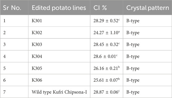 Table 5. Crystallinity degree (CI %) of starches from edited potato lines (K301- K306 and wild type Kufri Chipsona-I).