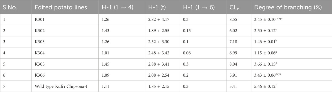 The 1H NMR study revealed that the edited lines have shown a reduced degree of branching that resulted in short amylopectin chains. These observations are in corroboration with the similar Cas9-mediated mutations generated in the potato SBE2 gene (Tuncel et al., 2019). Mutants with strong reductions in the degree of branching in starch significantly influence its physicochemical properties, affecting its functionality in various applications (Wang et al., 2022). More branching indicates a more branched amylopectin structure, leading to increased solubility and altered gelatinization behaviour. Conversely, a lower degree of branching suggests a more linear structure, typically associated with higher amylose content, resulting in different functional properties such as increased tendency for retrogradation (Li et al., 2023). These results substantiate the fact that starches with a higher degree of branching tend to have more surface area, which makes them more prone to enzymatic digestion, unlike amylose, which shows a low degree of branching. Thus, the CRISPR-Cas9-mediated editing of SBE2.1 and SBE2.2 genes in potato has significantly increased amylose and resistant starch content in the potato cultivar Kufri Chipsona-I, which is the utmost need of potato-based industries.