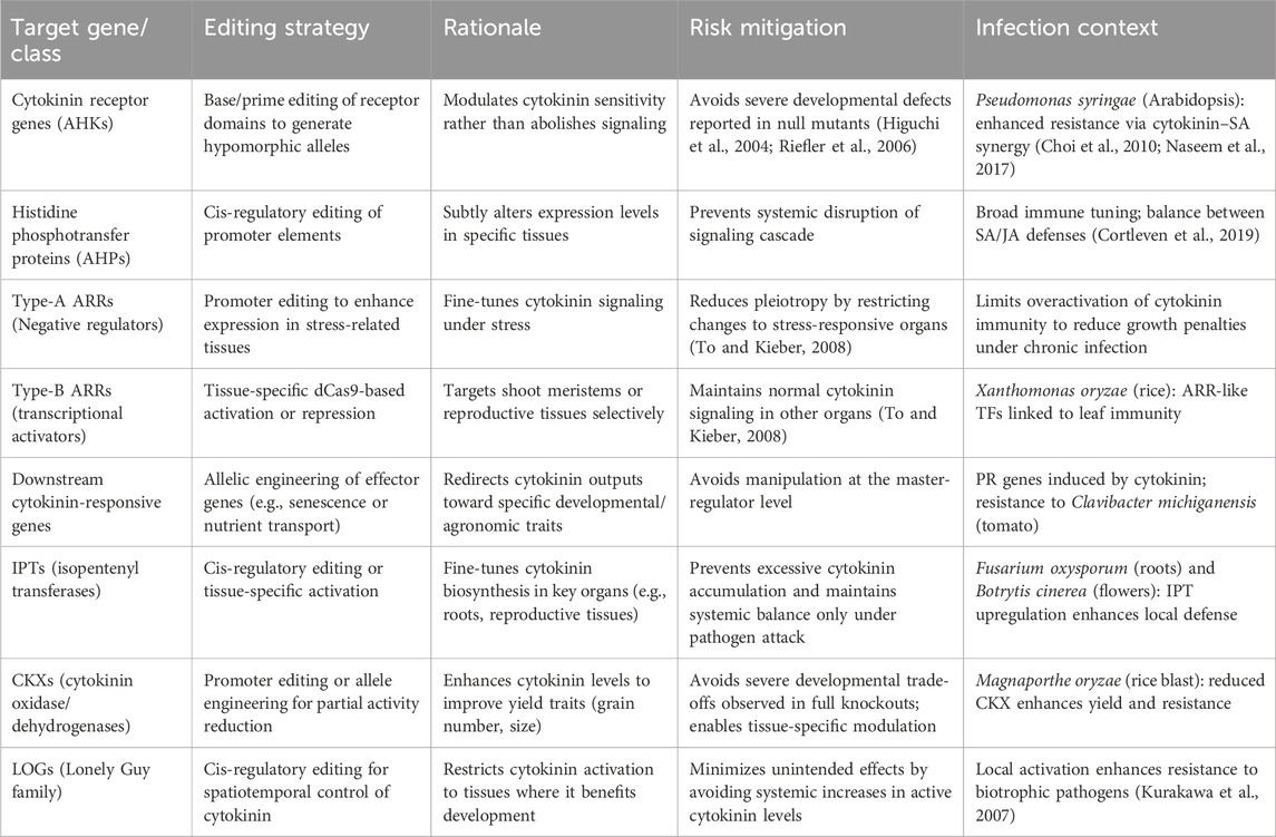 We propose strategies how CRISPR-based tools, such as base and prime editing, cis-regulatory editing, and tissue-specific dCas9 modulation, can convert cytokinin pathway genes from blunt levers into tuneable switches (Table 1). Importantly, such precision editing is not only about safeguarding developmental stability but also about enhancing resistance to major pathogens while maintaining yield. At the level of perception, cytokinin receptors (AHKs) act as critical protein hubs for integrating growth and immunity. CKs have been shown to potentiate SA-dependent defense while sometimes antagonizing jasmonic acid (JA)-mediated responses (Choi et al., 2010; Argueso et al., 2012). In Arabidopsis, elevated CK signaling boosts immunity against Pseudomonas syringae, a hemibiotrophic bacterial pathogen that suppresses SA pathways (Choi et al., 2010). Editing AHKs to create hypomorphic alleles holds promise to maintain sufficient defense activation without the severe developmental collapse observed in null mutants (Table 1).