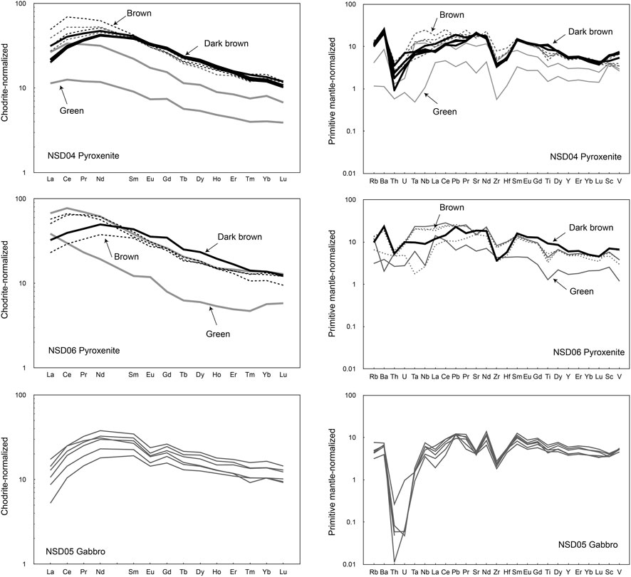 Figure 7. Chondrite-normalized rare earth element patterns (left) and primitive mantle-normalized trace element patterns (right) of amphibole from the poikilitic hornblende pyroxenite (NSD04 and NSD06) and hornblende gabbro (NSD05).