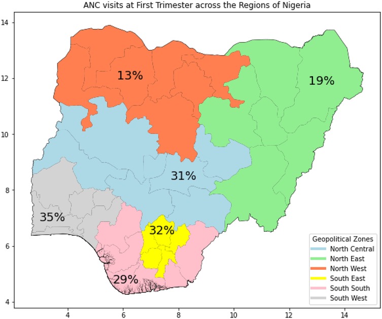 The overall prevalence of ANC visits during the first trimester across Nigeria with 24% commencing ANC at first trimester and 76% did not commence until later across Nigeria, revealing that only a minority of women commenced ANC early, with substantial regional variations. Figure 1 shows a map of Nigeria highlighting the regional disparities in the prevalence of first-trimester ANC visits. The South West region recorded the highest prevalence at 34.53%, while the North West region had the lowest at 12.51%. Figure 2 further depicts the proportion of first-trimester ANC visits across the regions, emphasizing significant regional disparities in ANC utilization.