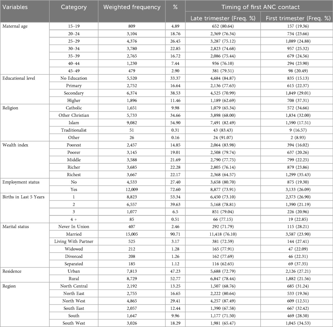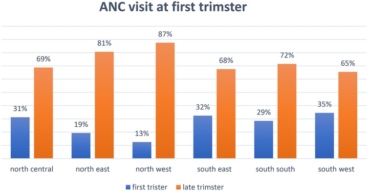 Although the World Health Organization (WHO) recommends that the first ANC contact should occur within the first 12 weeks of pregnancy (6), the prevalence of first-trimester ANC initiation in Nigeria remains low, with only 24% of women beginning ANC during this critical period births (12). Recent studies have highlighted the significant influence of sociodemographic factors on the utilization of ANC services by women of reproductive age. Factors such as education, economic status, religion, age at marriage, and place of residence have been identified as key determinants of ANC utilization (14–16). Early diagnosis of pregnancy issues allows for more prompt referrals for women in high-risk categories or who have complications. The timing of the first visit is around or preferably before 16 weeks of gestational age (6). Early initiation of ANC, ideally within the first trimester, is particularly important as it facilitates the timely identification and management of potential health risks. Early ANC contact provide numerous benefits, including opportunities for early risk assessment, management of pregnancy complications, and the provision of preventive measures such as vaccinations and nutritional supplements for both the mother and foetus (10, 17–19). Thus, this study aims to explore the sociodemographic determinants of early ANC contact and regional disparities among Nigerian women. Using multivariable multilevel logistic regression analysis, this research seeks to provide a comprehensive understanding of the factors influencing early ANC visits in Nigeria. The findings of this research have the potential to contribute to the development of targeted interventions that address both individual and systemic barriers to early ANC uptake, ultimately enhancing maternal and child health outcomes.